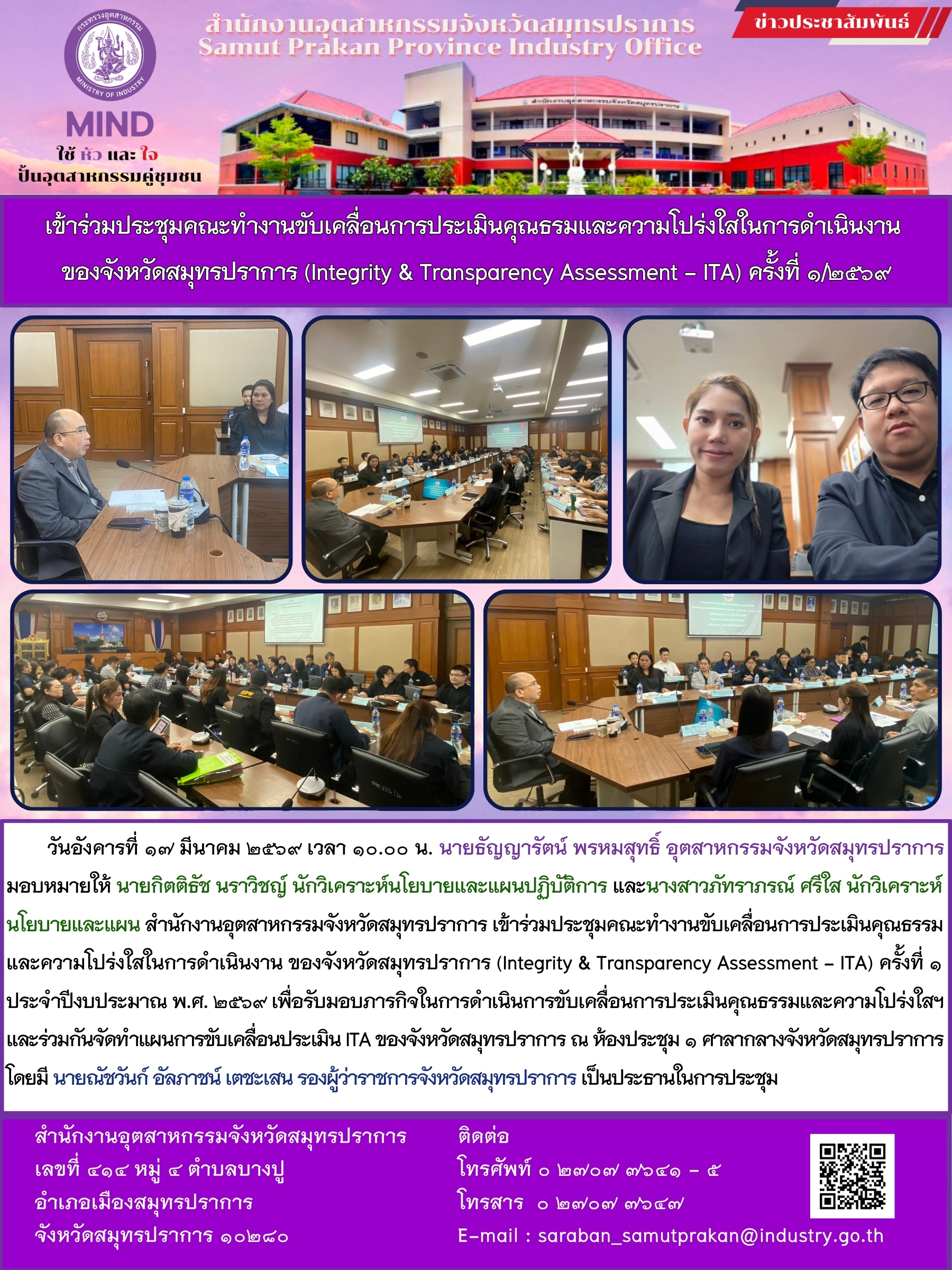 เข้าร่วมประชุมคณะทำงานขับเคลื่อนการประเมินคุณธรมและความโปร่งใสในการดำเนินงาน ของจังหวัดสมุทรปราการ (Integrity & Transparency Assessment - ITA)